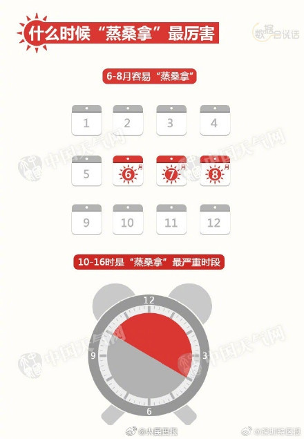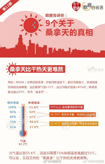 相同溫度下,相對(duì)濕度越大,體感溫度增幅就越明顯。當(dāng)日最高氣溫≥32℃,且日均相對(duì)濕度≥80%時(shí),體感溫度會(huì)超45℃,稱為桑拿天。遇上桑拿天,如何安全度過(guò)?