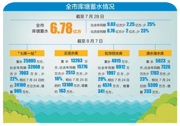 截至目前,全市庫塘蓄水出現一定增蓄,但總體蓄水量仍少于去年同期。截至7月28日,全市庫塘蓄水6.78億方,比去年同期9.03億方少2.25億方、少25%,比歷史同期8.78億方少2億方、少23%。