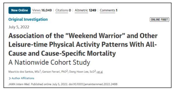 2022年7月《美國(guó)醫(yī)學(xué)會(huì)雜志·內(nèi)科學(xué)卷》刊發(fā)的一項(xiàng)涉及35萬(wàn)人大規(guī)模全國(guó)性前瞻性隊(duì)列研究表明,只要達(dá)到指南推薦的運(yùn)動(dòng)量,周末集中運(yùn)動(dòng)和平時(shí)規(guī)律運(yùn)動(dòng)都能對(duì)健康帶來(lái)好處。