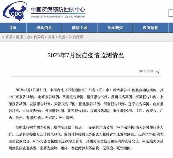 據中國疾病預防控制中心消息,2023年7月1日至31日,中國內地(不含港澳臺)23省(區、市)新增報告491例猴痘確診病例,其中廣東報告115例、北京報告81例、四川報告49例、浙江報告40例、湖南報告33例、江蘇報告31例、上海報告25例、安徽報告19例、天津報告17例、湖北報告17例、河南報告14例、遼寧報告12例、山東報告12例、吉林報告9例、云南報告4例、陜西報告4例、福建報告2例、重慶報告2例、山西、內蒙古、廣西、貴州、青海各1例,無重癥、死亡病例。