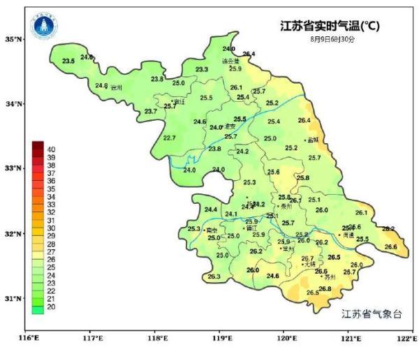 最低溫度:淮北地區22~23℃,其他地區24~25℃。