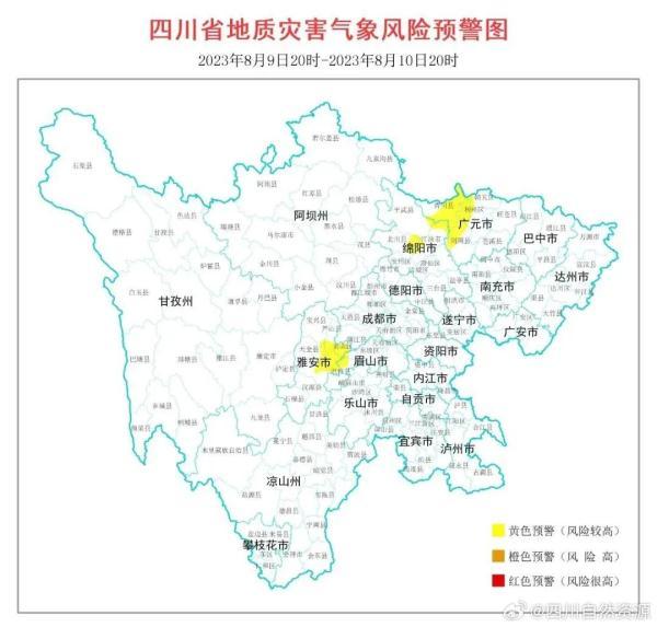 8月9日20時至10日20時,廣元市青川、劍閣、朝天、利州、昭化,綿陽市平武、北川、江油、梓潼,雅安市蘆山、滎經、天全、雨城、名山,眉山市丹棱、洪雅等16個縣(市、區)可能發生山洪災害。