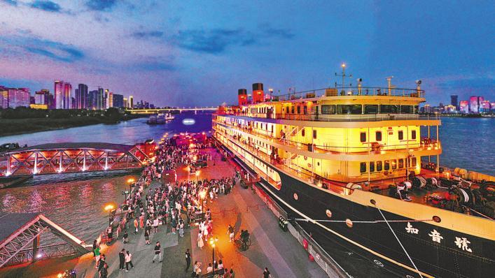 8月8日傍晚,武漢兩江四岸云蒸霞蔚,燈火璀璨,停靠在漢口江畔的“知音號”吸引大量游客前來游玩。《知音號》作為長江首部漂移式多維體驗劇,它的主劇場“知音號”,以20世紀初民生公司的江華輪為原型,讓觀眾登上碼頭那一刻起,就仿佛被拉回百年前的漢口大碼頭,開業數年來,逐漸跑出江城文旅產業發展的新賽道,成為外地游客游玩江城的必打卡點。(湖北日報全媒記者 何宇欣 通訊員 江朝 攝)