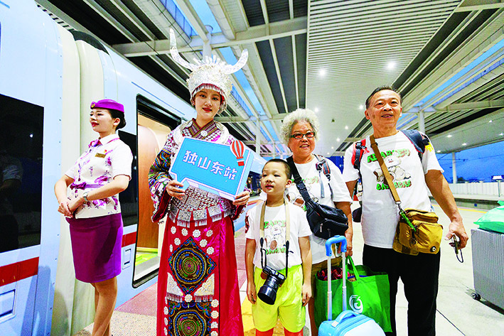 八月八日,旅客在貴陽北站和身著民族服裝的乘務(wù)員合影。新華社記者劉續(xù)攝