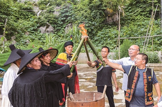 彝族同胞用傳統方式擊石取火,開啟了火把節。