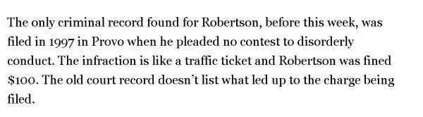 FOX13還稱,在此次被FBI槍殺前,羅伯森唯一的犯罪記錄是1997年的一次“擾亂治安”的記錄。從當時記錄來看,此事似乎是因為交通違章罰款引發的。