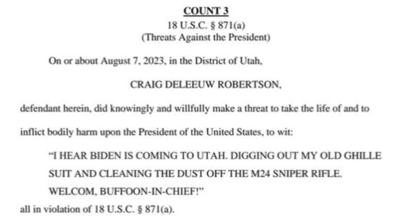 FBI槍殺羅伯森之前,已經對他提起了三項指控,分別是跨州威脅他人、威脅美國總統、威脅報復聯邦執法人員。