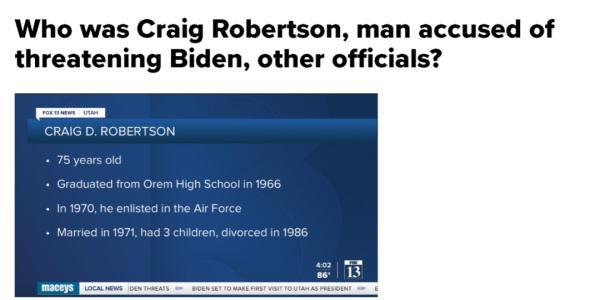 但美國福克斯新聞網在猶他州的地方臺FOX13表示,盡管FBI用來指控羅伯森的那些帖文令他看起來像個暴力的危險分子,但他實際上一直過著“平靜”的生活,曾是一名建筑檢驗員,還曾于1970年入過伍,在美國空軍當過兵。