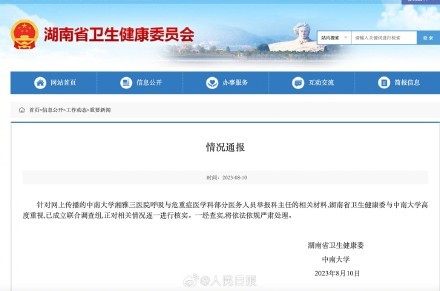 據(jù)湖南省衛(wèi)健委官網(wǎng):針對(duì)網(wǎng)上傳播的中南大學(xué)湘雅三醫(yī)院呼吸與危重癥醫(yī)學(xué)科部分醫(yī)務(wù)人員舉報(bào)科主任的相關(guān)材料,湖南省衛(wèi)生健康委與中南大學(xué)高度重視,已成立聯(lián)合調(diào)查組,正對(duì)相關(guān)情況逐一進(jìn)行核實(shí)。一經(jīng)查實(shí),將依法依規(guī)嚴(yán)肅處理。