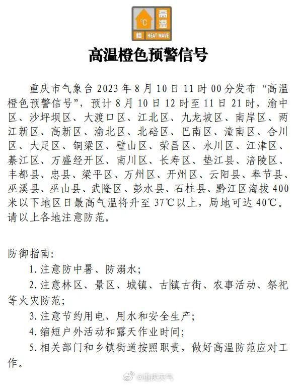 重慶市氣象臺2023年8月10日11時00分發布“高溫橙色預警信號”。