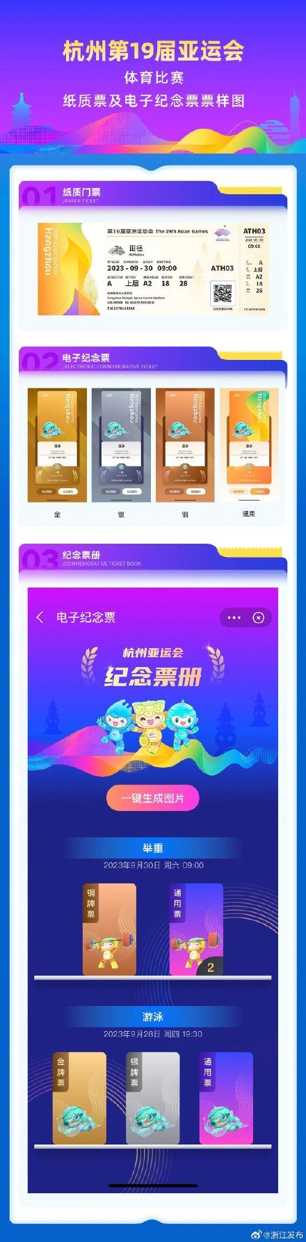 日前,杭州亞運(yùn)會(huì)體育比賽紙質(zhì)票及電子紀(jì)念票票樣設(shè)計(jì)圖發(fā)布。紙質(zhì)票票面設(shè)計(jì)以核心圖形“潤(rùn)澤”為基礎(chǔ),以核心色彩系統(tǒng)“淡妝濃抹”中的“月桂黃”為主色,結(jié)合“三潭印月”等杭州標(biāo)志性景點(diǎn)剪影設(shè)計(jì)和各項(xiàng)比賽體育圖標(biāo),通過(guò)歷史與現(xiàn)代的文化碰撞,傳遞著主辦城市獨(dú)特的文化韻味;電子紀(jì)念票分金、銀、銅、通用四種類型,抽中比例分別為5%、10%、15%、70%,為呼吁全民助力綠色亞運(yùn),@杭州第19屆亞運(yùn)會(huì)推薦使用電子票。