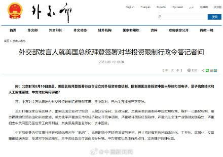 外交部發(fā)言人就美國(guó)總統(tǒng)拜登簽署對(duì)華投資限制行政令答記者問。