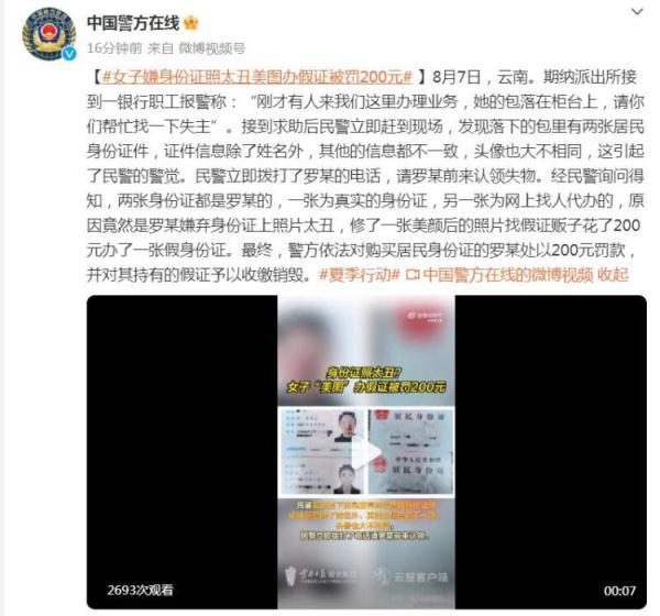 8月7日,云南。期納派出所接到一銀行職工報警稱:“剛才有人來我們這里辦理業務,她的包落在柜臺上,請你們幫忙找一下失主”。接到求助后民警立即趕到現場,發現落下的包里有兩張居民身份證件,證件信息除了姓名外,其他的信息都不一致,頭像也大不相同,這引起了民警的警覺。民警立即撥打了羅某的電話,請羅某前來認領失物。經民警詢問得知,兩張身份證都是羅某的,一張為真實的身份證,另一張為網上找人代辦的,原因竟然是羅某嫌棄身份證上照片太丑,修了一張美顏后的照片找假證販子花了200元辦了一張假身份證。最終,警方依法對購買居民身份證的羅某處以200元罰款,并對其持有的假證予以收繳銷毀。