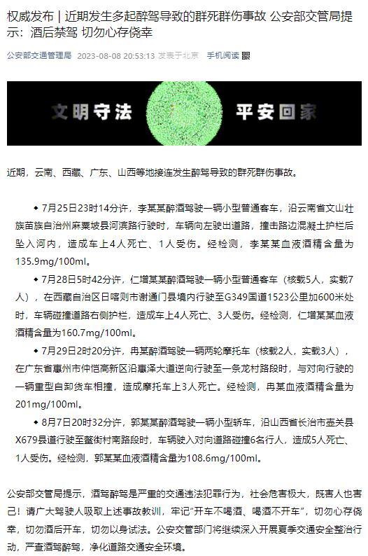 據(jù)公安部交通管理局微信公眾號8月8日消息,近期,云南、西藏、廣東、山西等地接連發(fā)生醉駕導致的群死群傷事故。
