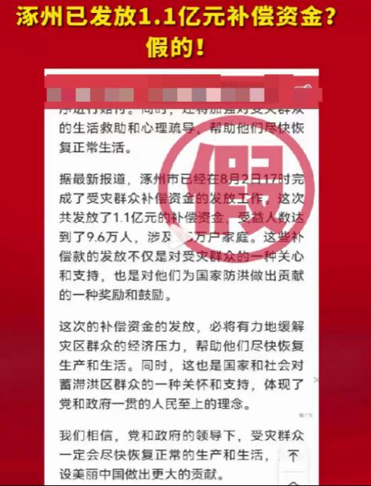 近日,網傳消息稱“河北省涿州市已經在8月2日完成了1.1億受災群眾補償資金的發放工作,受益人數達到了9.6萬人,涉及3.5萬戶家庭”。