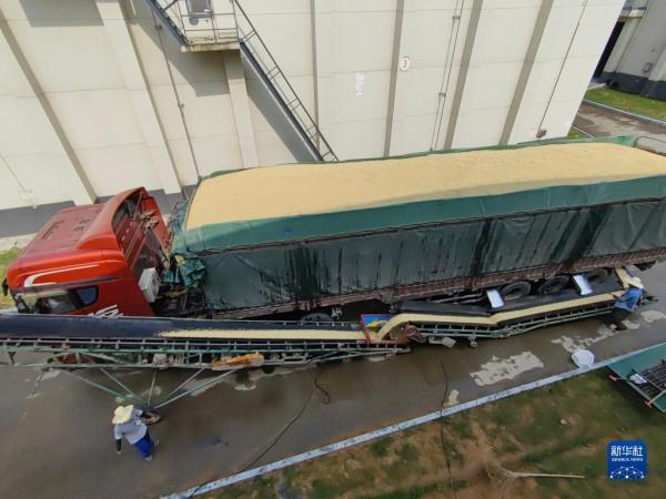 在江西省南昌縣橫崗國家糧食儲備庫,種糧大戶開倉卸載糧車上的早稻(8月8日攝)。