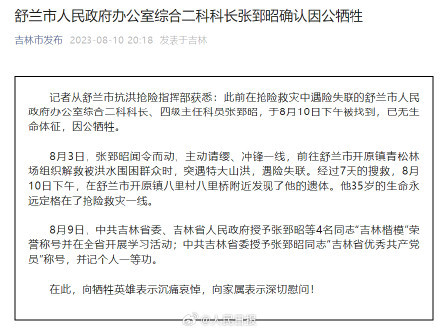 此前在搶險(xiǎn)救災(zāi)中遇險(xiǎn)失聯(lián)的舒蘭市人民政府辦公室綜合二科科長(zhǎng)、四級(jí)主任科員張郅昭,于8月10日下午被找到,已無(wú)生命體征,因公犧牲。8月3日,張郅昭前往舒蘭市開(kāi)原鎮(zhèn)青松林場(chǎng)組織解救被洪水圍困群眾時(shí),突遇特大山洪,遇險(xiǎn)失聯(lián)。經(jīng)過(guò)7天的搜救,8月10日下午,在舒蘭市開(kāi)原鎮(zhèn)八里村八里橋附近發(fā)現(xiàn)了他的遺體。他35歲的生命永遠(yuǎn)定格在了搶險(xiǎn)救災(zāi)一線(xiàn)。(新華社)