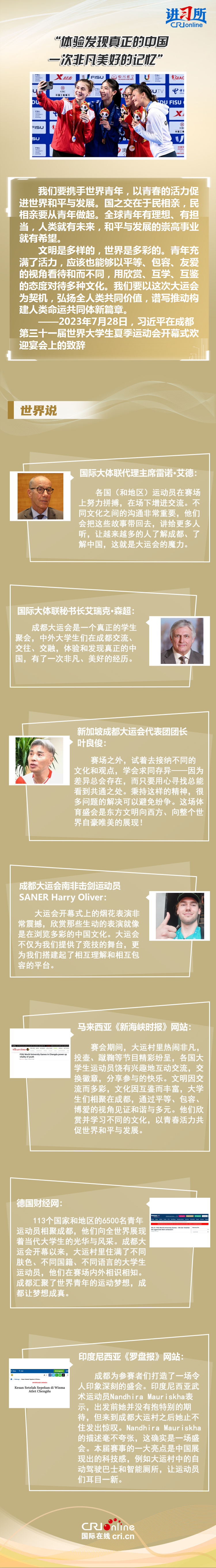 正如習近平主席所說,世界大學生運動會自誕生以來,就一直是青春的盛會、團結的盛會、友誼的盛會。成都大運會向世界呈現了一屆具有中國特色、時代氣息、青春風采的國際體育盛會,贏得國際社會贊譽。