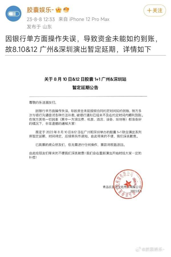 “膠囊娛樂”宣布另一演出延期。微博截圖