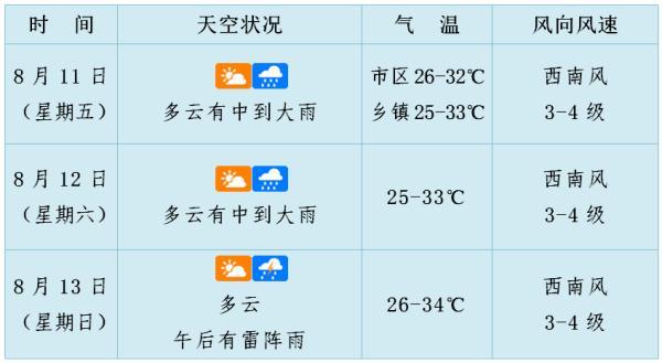 8月11日08時(shí)到13日20時(shí):多云有雷陣雨,西南風(fēng)5-6級(jí),雷雨時(shí)陣風(fēng)7-8級(jí)。