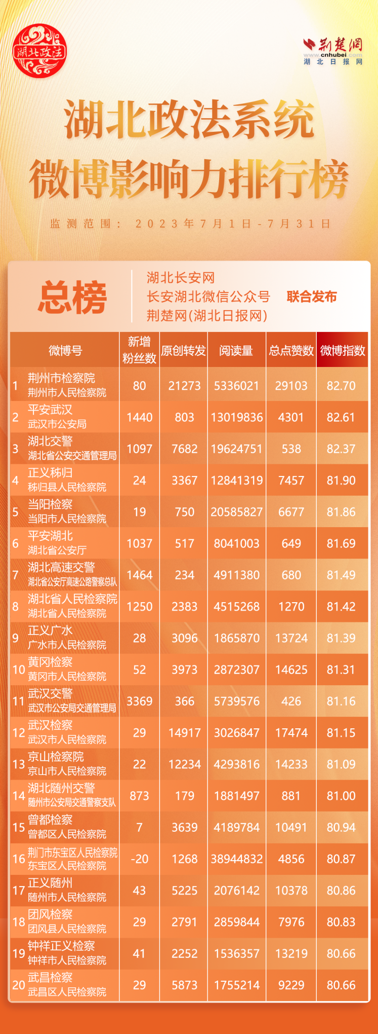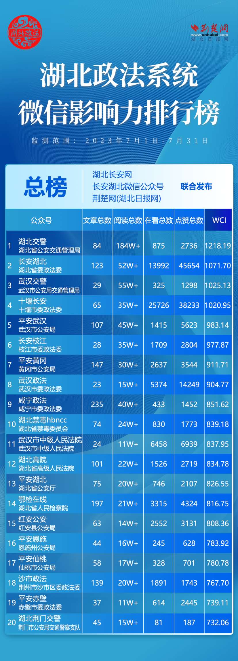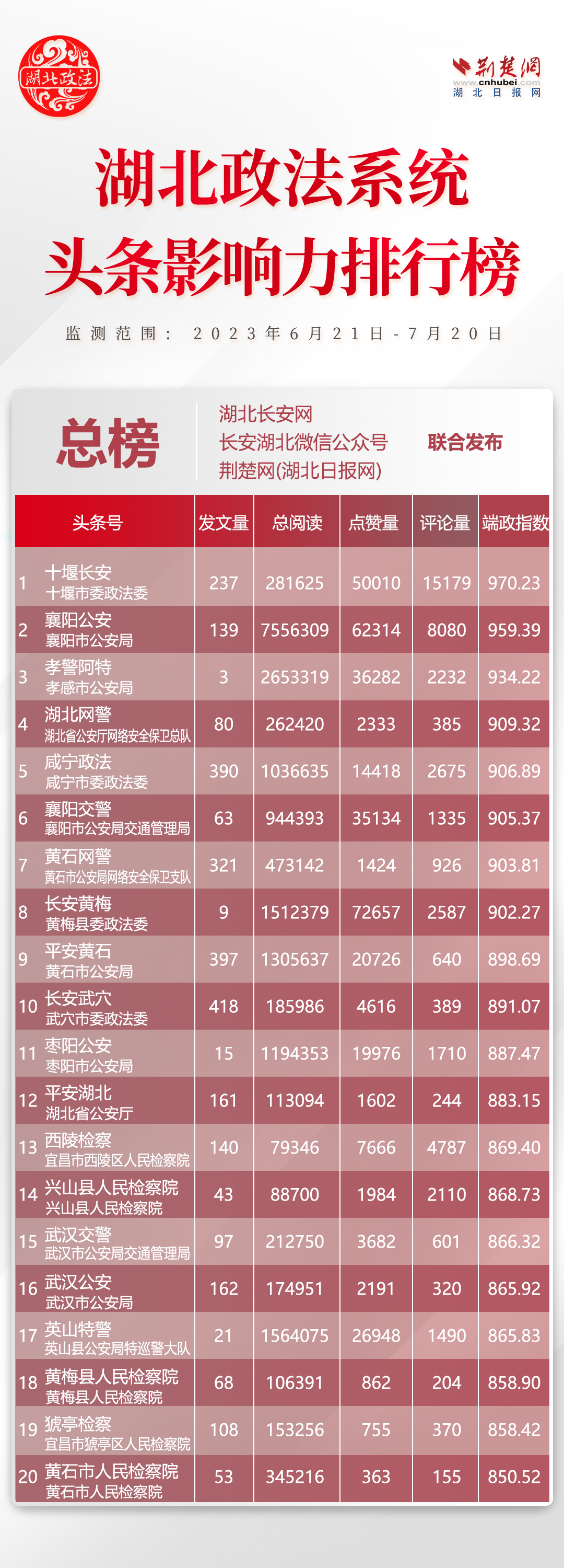 8月10日,湖北省委政法委官網湖北長安網、官微長安湖北,聯合荊楚網(湖北日報網)、楚天輿情數據研究院發布湖北政法系統新媒體影響力排行7月榜單。具體榜單如下: