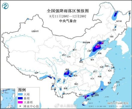 中央氣象臺8月11日18時發布暴雨黃色預警:預計,8月11日20時至12日20時,黑龍江西部和東北部、吉林中部、北京南部和東部、天津、河北中南部和東北部、山西東南部、河南北部、山東西北部、陜西關中地區、四川盆地南部、云南中西部、廣西東南部、廣東南部和東部、福建南部、海南島北部和西南部等地有大到暴雨,其中,河北中部和東北部、天津南部、四川盆地西南部、廣西南部沿海、廣東西南部等地的部分地區有大暴雨(100~180毫米)。上述部分地區伴有短時強降水(最大小時降雨量30~50毫米,局地可超過60毫米),局地有雷暴大風或冰雹等強對流天氣。