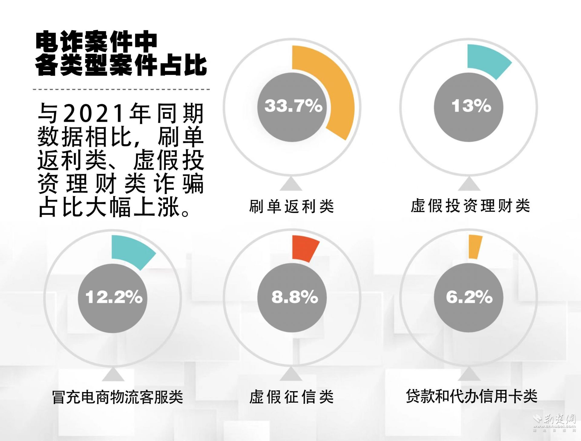 從電詐犯罪形式來看,我省電詐案件中,刷單返利類、虛假投資理財類、冒充電商物流客服類、虛假征信類、貸款和代辦信用卡類詐騙占比較高,分別為33.7%、13%、12.2%、8.8%、6.2%。與2021年同期數據相比,刷單返利類、虛假投資理財類詐騙占比大幅上漲。