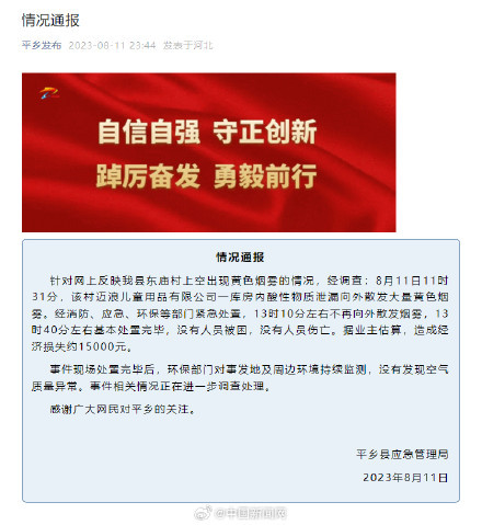 河北平鄉縣應急管理局11日通報:針對網上反映我縣東廟村上空出現黃色煙霧的情況,經調查:8月11日11時31分,該村邁浪兒童用品有限公司一庫房內酸性物質泄漏向外散發大量黃色煙霧。經消防、應急、環保等部門緊急處置,13時10分左右不再向外散發煙霧,13時40分左右基本處置完畢,沒有人員被困,沒有人員傷亡。據業主估算,造成經濟損失約15000元。事件現場處置完畢后,環保部門對事發地及周邊環境持續監測,沒有發現空氣質量異常。(平鄉發布)