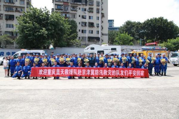 8月11日,萬州區(qū)藍天救援隊訓練基地,赴河北淶水開展救援任務重慶藍天救援隊凱旋而歸,受到后方基地隊友、親屬及群眾的熱烈歡迎。通訊員馮濤攝