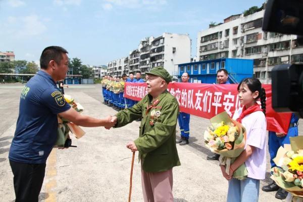 8月11日,少先隊員、老兵代表為藍天救援隊隊員送上鮮花。通訊員 馮濤攝