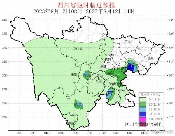 據四川省氣象臺8月12日8時發布的短時臨近預報,8月12日08~14時,成都、雅安、樂山、眉山、資陽、內江、自貢、宜賓、瀘州、遂寧、南充、廣安12市及綿陽、德陽2市西部有陣雨或雷雨,部分地方中到大雨,遂寧、南充、廣安3市局部有暴雨,盆地其余地方多云間晴;川西高原大部和攀西地區陰天間多云有陣雨或雷雨,涼山州局部有中到大雨。