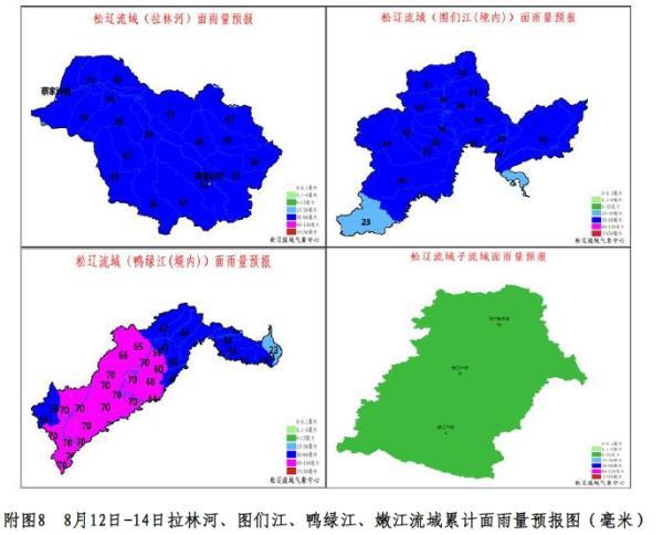 流域降雨預(yù)報(bào):拉林河流域過程累計(jì)面雨量為30~50毫米,較強(qiáng)降雨主要時(shí)段為12日夜間至13日;圖們江流域過程面雨量為10~25毫米,較強(qiáng)降雨主要時(shí)段為13日至14日;鴨綠江流域過程面雨量為40~60毫米,較強(qiáng)降雨主要時(shí)段為12日夜間至13日。嫩江上中游流域面雨量為8~15毫米,主要出現(xiàn)在12日白天至13日。