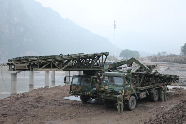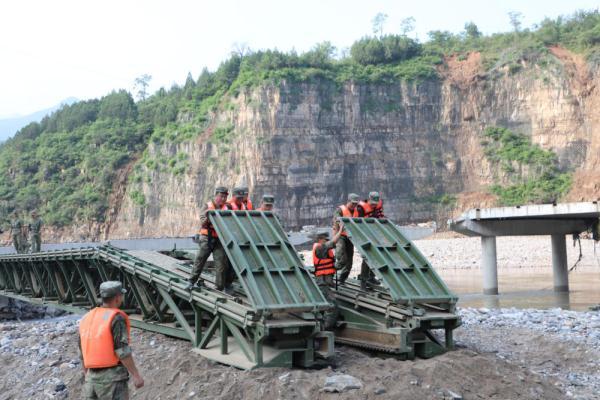 ↑8月8日,陸軍第82集團軍某工兵旅官兵在北京市房山區十渡鎮北石門村北石門橋段架設重型支援橋。新華社記者李曉明 攝