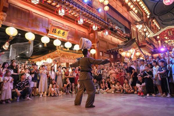 在長安十二時辰主題街區的仿唐市井街巷上,一個身著古裝的“賣藝人”大聲招呼游客,蹬傘、頂缸、抖杠等絕活精彩亮相,引起游客陣陣叫好。