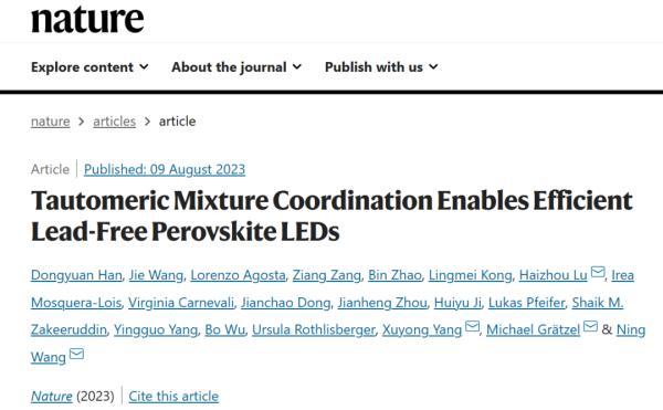 東南大學(xué)集成電路學(xué)院青年教師盧海洲與吉林大學(xué)王寧教授,洛桑聯(lián)邦理工大學(xué)Michael Graetzel教授,上海大學(xué)楊緒勇教授等合作在《自然》(Nature)上發(fā)表了題為“TautomericMixture Coordination Enables Efficient Lead-Free PerovskiteLEDs”的研究論文,通過(guò)強(qiáng)化學(xué)配位調(diào)控使得無(wú)鉛鈣鈦礦LED發(fā)光效率首次突破20%(Nature2023,doi.org/10.1038/s41586-023-06514-6)。盧海洲為文章共同通訊作者,東南大學(xué)集成電路學(xué)院為共同通訊單位。