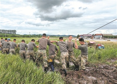8月8日,第78集團軍某旅黨員突擊隊在吉林省舒蘭市七里鄉(xiāng)農(nóng)林村搶修電力設施。毛冰峰攝