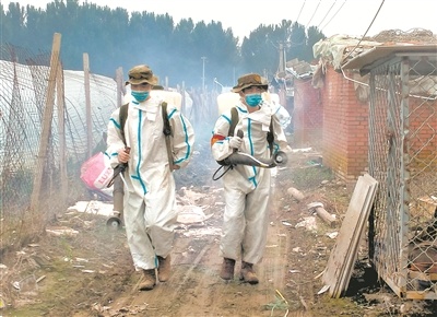 8月11日,北京衛(wèi)戍區(qū)某團官兵對北京市房山區(qū)受災村莊進行防疫消殺作業(yè)。李義樂攝
