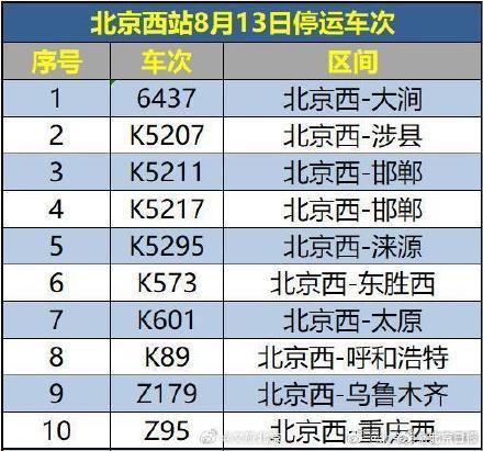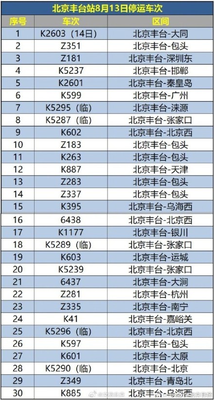 據@北京西站官方微博,受水害影響,8月13日北京西站、北京豐臺站部分列車停運,已購買停運列車車票的旅客,可于30日內辦理全額退票手續。請廣大旅客合理安排出行,關注鐵路部門公告。