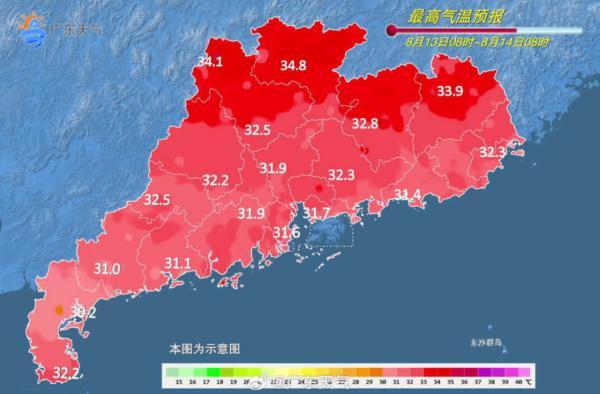 8月15日,粵北市縣多云間陰天,有中(雷)雨,局部暴雨,其余市縣多云,有分散(雷)陣雨。最高氣溫:粵北市縣32℃~33℃,其余市縣33℃~36℃。