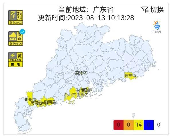 8月13日,粵東市縣有大雨到暴雨,局部大暴雨,粵西市縣大雨,局部暴雨,珠江三角洲南部市縣有中到大雨,局部暴雨,其余市縣多云,有(雷)陣雨,局部大雨或暴雨。中北部市縣最高氣溫有所回升,最高氣溫:粵北市縣33℃~35℃,其余市縣30℃~33℃。