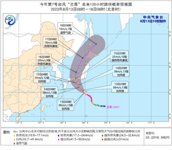 今年第7號臺風“蘭恩”(LAN)(臺風級)的中心今天(13日)上午8點鐘位于日本神奈川縣橫濱市偏南方向約640公里的西北太平洋洋面上,中心附近最大風力有13級(38米/秒)。預計,“蘭恩”將以每小時10-15公里的速度向西北方向移動,強度變化不大,并逐漸向日本本州島南部沿海靠近。