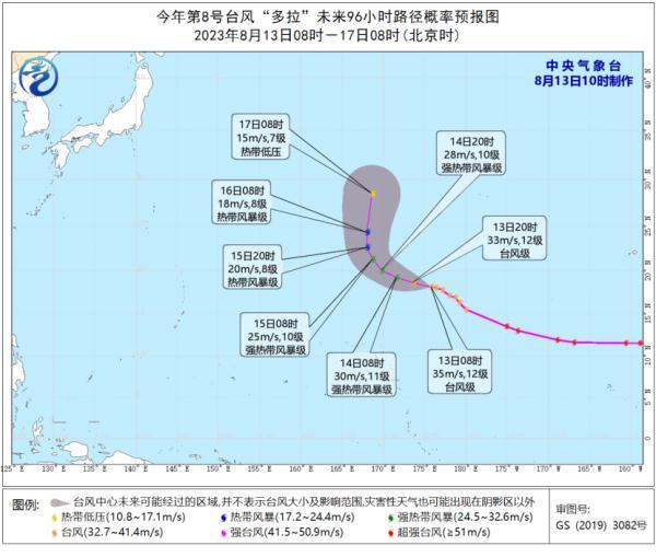 今年第8號臺風“多拉”(DORA)(臺風級)的中心今天(13日)上午8點鐘位于美國關島偏東方向約3350公里的西北太平洋洋面上,,中心附近最大風力有12級(35米/秒)。預計,“多拉”將以每小時20公里左右的速度向西偏北方向移動,強度逐漸減弱。