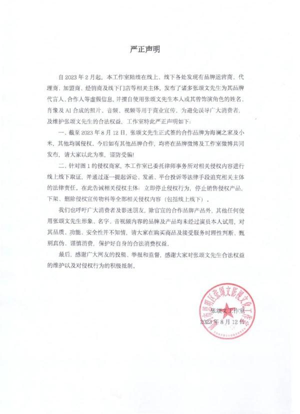 聲明中表示,截至2023年8月12日,張頌文正式簽約的合作品牌僅海瀾之家和小米,其他均屬侵權,呼吁消費者及影迷理性判斷。