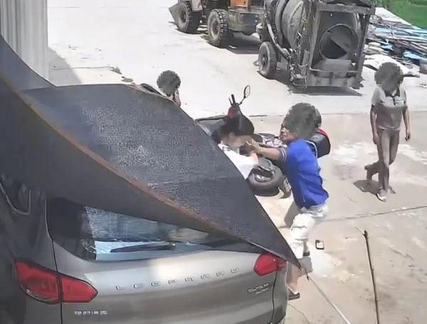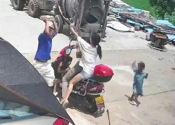 監控視頻顯示,一名中年婦女和一名年輕女子合騎一輛電動車,前方還坐著兩個小孩。這時,一名身穿藍衣的中年男子突然出現,手持異物徑直砸向騎車的中年女子頭部。