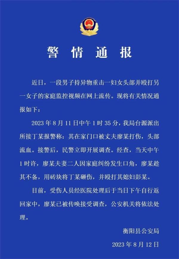 近日,一段男子持異物重擊一婦女頭部并毆打另一女子的家庭監控視頻在網上流傳。8月12日晚,衡陽縣公安局對此事發布警情通報。