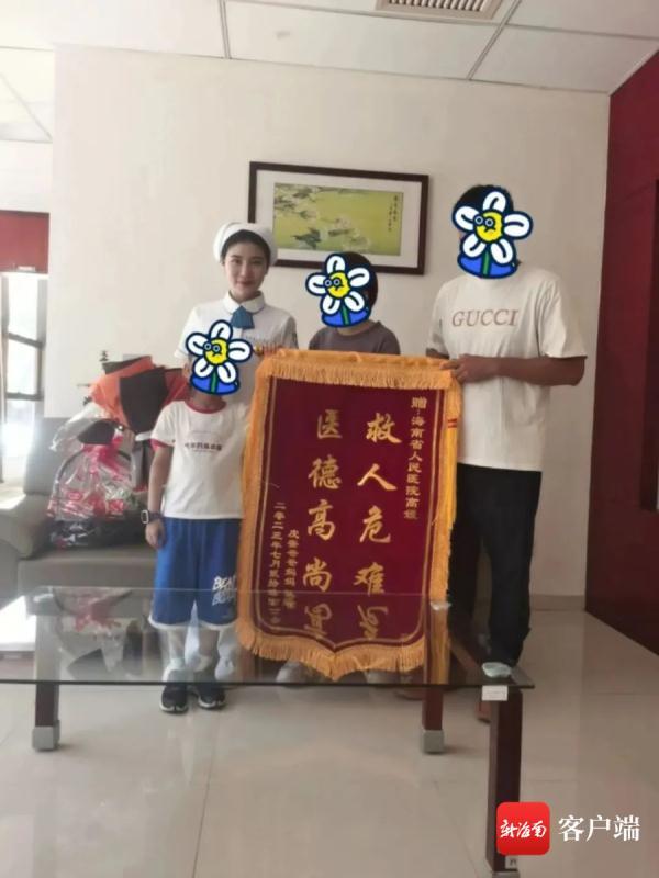 7月24日下午,皮皮的爸爸媽媽帶著一面寫著“救人危難,醫(yī)德高尚”錦旗,專程來到海南省人民醫(yī)院感謝高媛。
