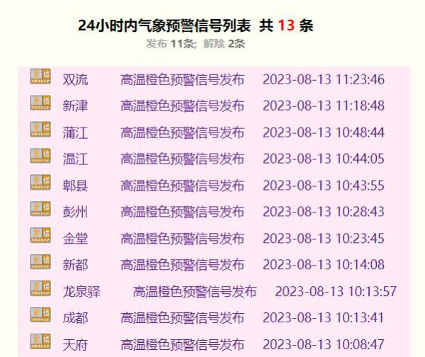 成都市氣象臺2023年08月13日10時00分發(fā)布高溫橙色預(yù)警信號:預(yù)計成都市錦江區(qū)、青羊區(qū)、金牛區(qū)、武侯區(qū)、成華區(qū)、青白江區(qū)、高新西區(qū)、東部新區(qū)、高新南區(qū)的所有鎮(zhèn)(街道)未來24小時內(nèi)最高氣溫將升至35℃以上。高溫時段主要出現(xiàn)在13日13時至18時。請注意防范高溫帶來的不利影響。