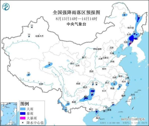 預(yù)計,13日14時至14日14時,遼寧東部、吉林東部、黑龍江中東部以及江西東北部、浙江西南部和東部沿海、湖北西南部、重慶東南部、貴州東部和南部、云南西部、廣東沿海、青海西南部、新疆沿天山等地部分地區(qū)有大到暴雨,其中,遼寧東部等地局地有大暴雨(100~150毫米)。上述部分地區(qū)伴有短時強(qiáng)降水(最大小時降雨量30~50毫米,局地可超過60毫米),局地有雷暴大風(fēng)等強(qiáng)對流天氣。