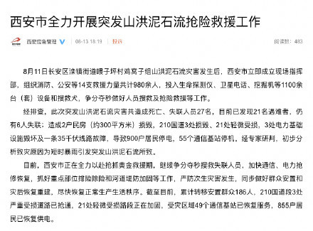 經排查,此次突發山洪泥石流災害共造成死亡、失聯人員27名,目前已發現21名遇難者,仍有6人失聯;造成2戶民房(約300平方米)損毀,210國道3處損毀、21處輕微受損,3處電力基礎設施毀壞及一條35千伏線路故障,導致900戶居民停電,55個通信基站停機。經專家研判,初步分析致災原因為短時暴雨引發突發山洪泥石流所致。目前,西安市正在全力以赴搶抓黃金救援期,繼續爭分奪秒搜救失聯人員,加快通信、電力搶修恢復,抓好重點部位排險除險和河道堤防加固等工作,嚴防次生災害發生,同步做好群眾安置和災后恢復重建,盡快恢復正常生產生活秩序。