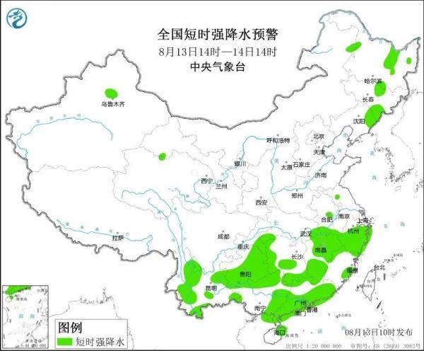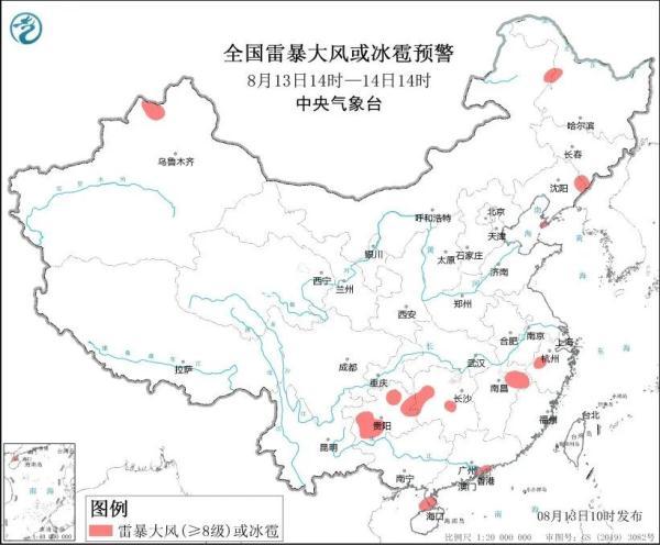 預計8月13日14時至14日14時,黑龍江中部、吉林北部和東南部、遼寧東北部、安徽中南部、湖北東部、湖南西部和南部、江西、浙江、福建西北部和東部、重慶東南部、貴州、云南、廣西北部和東部、廣東、海南島東部等地的部分地區將有短時強降水天氣,最大小時雨量30-50毫米,局地可達60毫米以上;此外,黑龍江西部、遼寧東部、湖南西部、江西東北部、浙江西部、貴州西部和東北部、廣東南部及近海等地的部分地區將有8-10級雷暴大風或冰雹天氣。